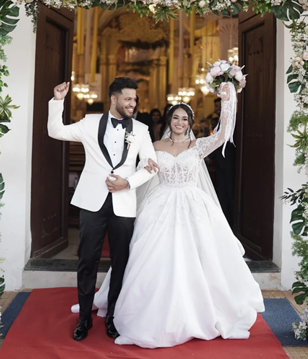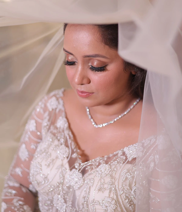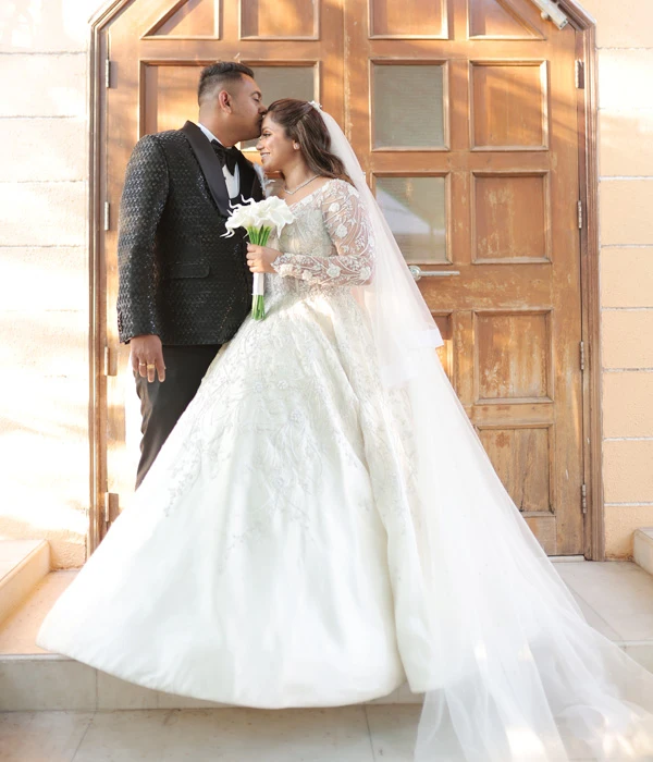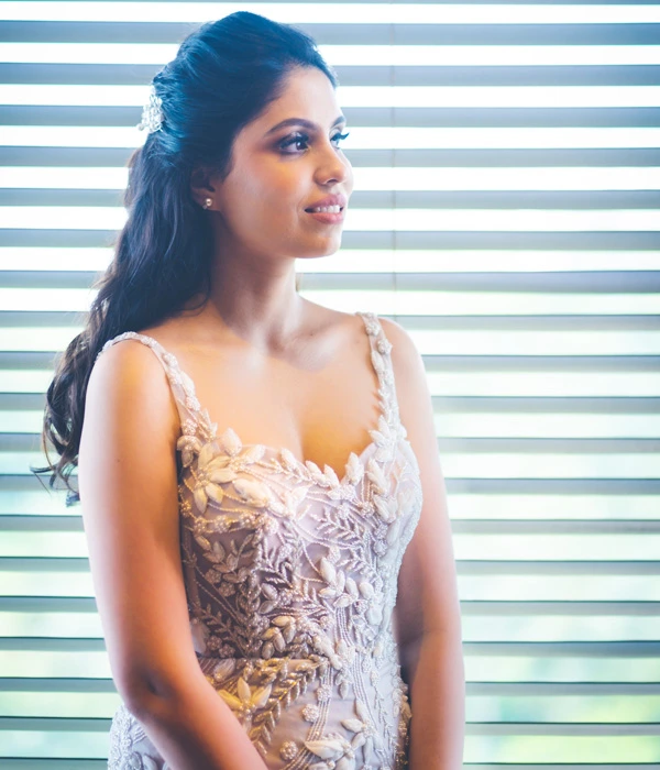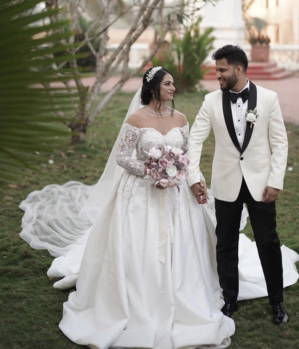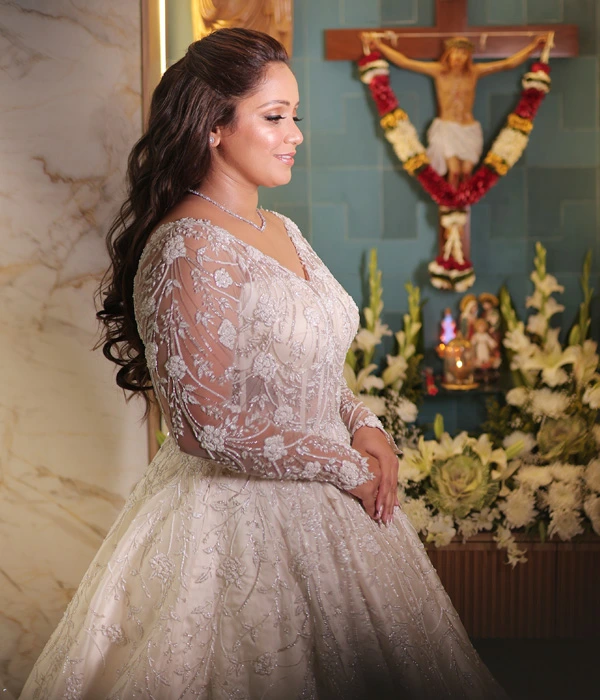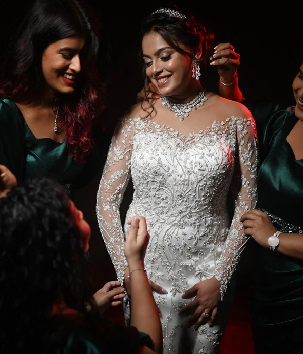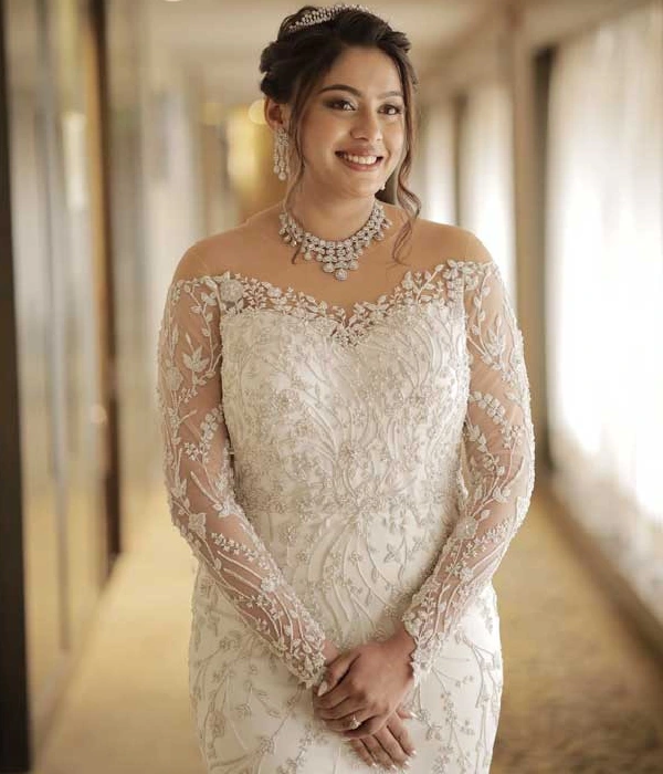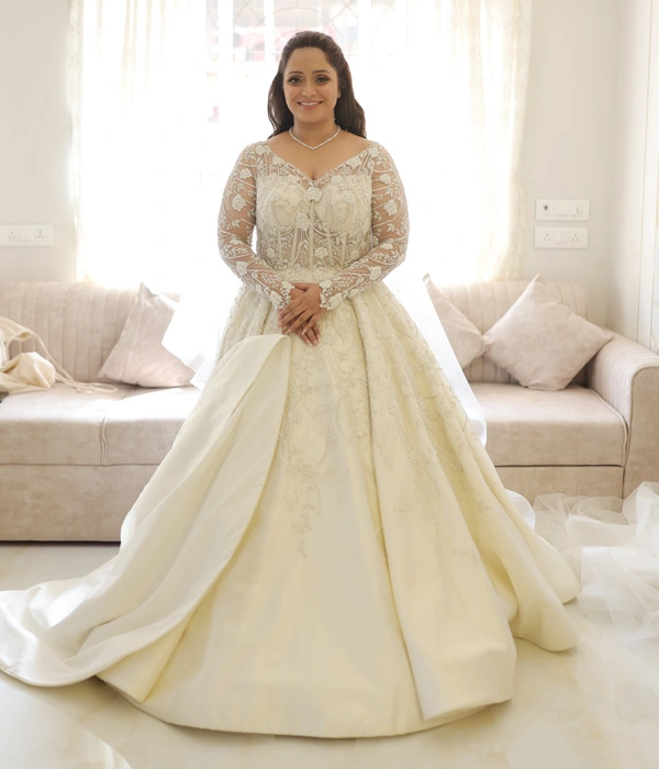 Indulge in the epitome of luxury and sophistication with this exquisite white mermaid gown—a masterpiece of elegance. Adorned with intricate hand embroidery, every stitch is interwoven with delicate glass beads, luminous pearls, and sparkling diamonds, creating a design that radiates opulence. The flattering neckline accentuates your natural beauty, while the gown’s sleek, figure-hugging silhouette flows effortlessly into a long, graceful train. Each detail, from the precise handwork to the carefully placed embellishments, is crafted with exceptional care, creating a stunning blend of modern glamour and timeless allure. Designed by a leading white wedding designer in India, this gown is perfect for any formal occasion where you wish to captivate and shine.