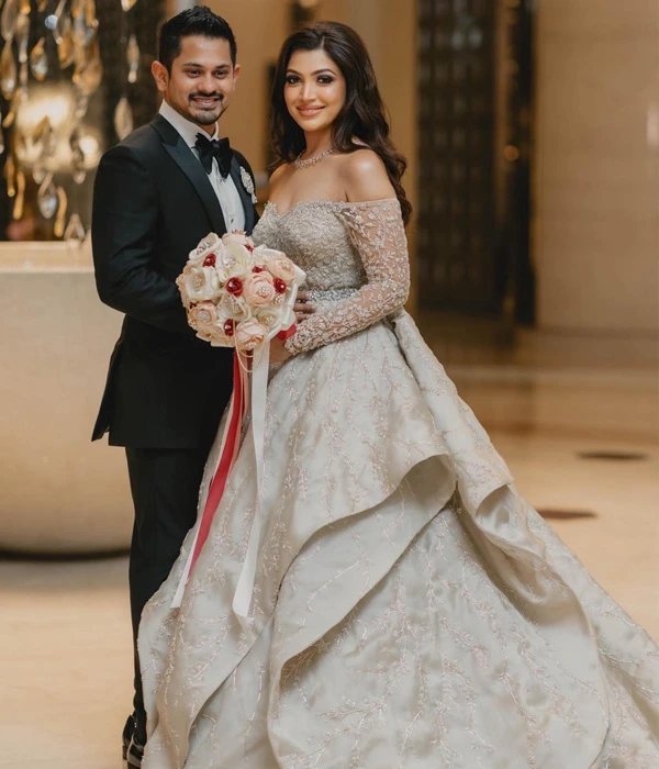 The skilled handwork on this gown is a true testament to fine craftsmanship. Intricately adorned with glass beads and tiny, hand-sewn flowers, each element is meticulously crafted to form a delicate yet elaborate design. The precision-set diamonds add a dazzling touch, reflecting light beautifully with every movement, ensuring you sparkle from every angle. The harmonious blend of these luxurious details from the shimmering beads to the expertly placed diamonds elevates this bridal gown to new heights of opulence. The result is a breathtaking creation that radiates elegance and sophistication, making it the latest designer gown for wedding celebrations where only the most exquisite will do. Perfect for a bride who desires to shine on her special day.