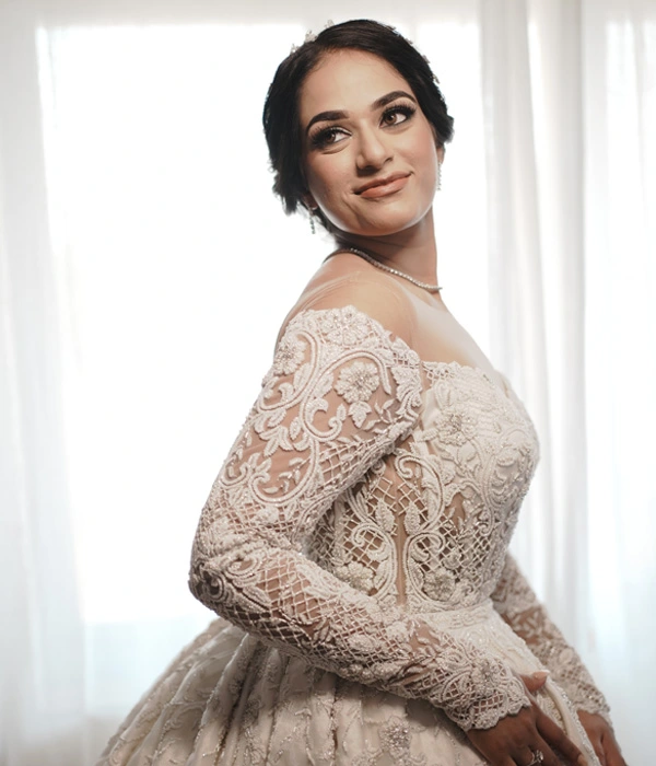 This stunning off shoulder gown with an illusion effect on the neckline is a vision of sophistication and glamour, featuring full sleeves that add a touch of regal elegance. Adorned with an array of gems and jewels, the gown creates a dazzling three-dimensional effect that catches the light beautifully. The fitted design highlights and accentuates your curves, ensuring a flawless silhouette. Perfectly combining opulence with grace, this gown offers a perfect blend of comfort and high fashion, making it an exquisite choice for a bride who wants to shine with timeless elegance and a touch of modern sparkle on her special day.